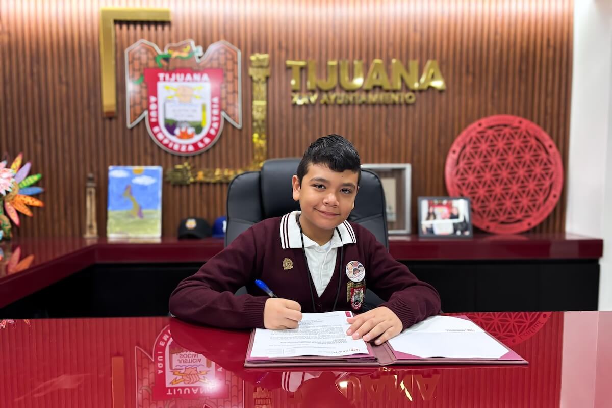 Tijuana.- El pasado 28 de abril, el presidente municipal, Ismael Burgueño Ruiz, llevó a cabo una ceremonia especial en la que niñas y niños asumieron cargos honorarios por un día, con el fin de hacer valer su voz y sus propuestas para mejorar su comunidad, entre ellos, Miguel Ángel Ramírez Aguilar, quien asumió el cargo de niño presidente municipal honorario.