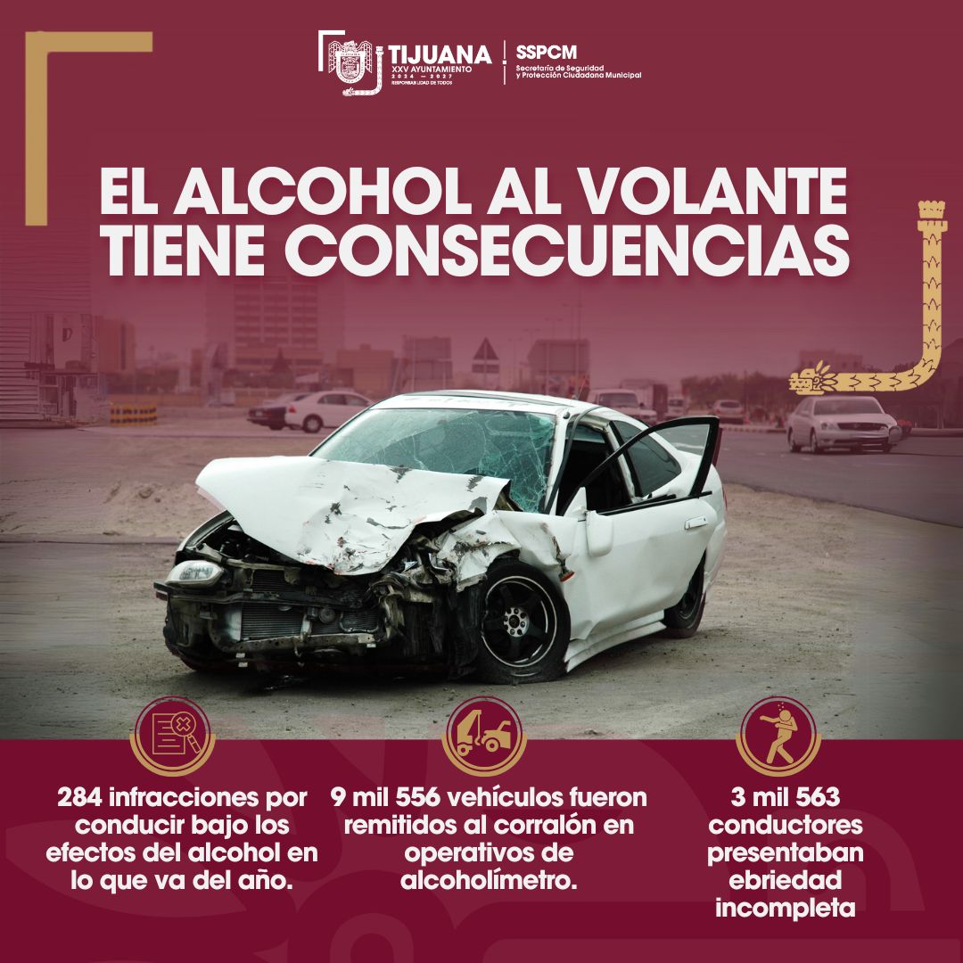 Tijuana, Baja California.- La Secretaría de Seguridad y Protección Ciudadana Municipal (SSPCM) reitera su compromiso de proteger la vida e integridad de quienes transitan por las vialidades de la ciudad, por lo que mantendrá cero tolerancia ante conductores que manejen bajo los influjos del alcohol. Esta medida busca prevenir incidentes de tránsito que puedan tener consecuencias fatales.