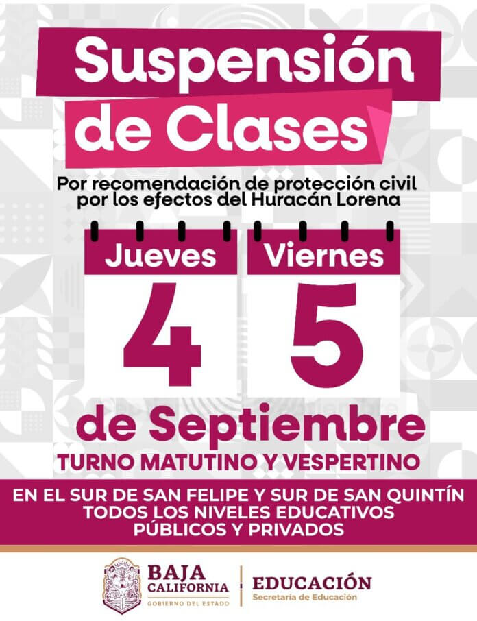 Mexicali.- De acuerdo con los pronósticos meteorológicos, los efectos del Huracán Lorena comenzarán a sentirse a partir de este jueves 4 de septiembre en la zona sur de San Quintín y en el sur de San Felipe, con especial impacto en la delegación de Bahía de Los Ángeles, por ello la Secretaría de Educación, informó que por recomendación de la Coordinación de Protección Civil, se suspenderán las clases presenciales para las zonas señaladas, los días 4 y 5, en ambos turnos y para todos los niveles de escuelas públicas y privadas.