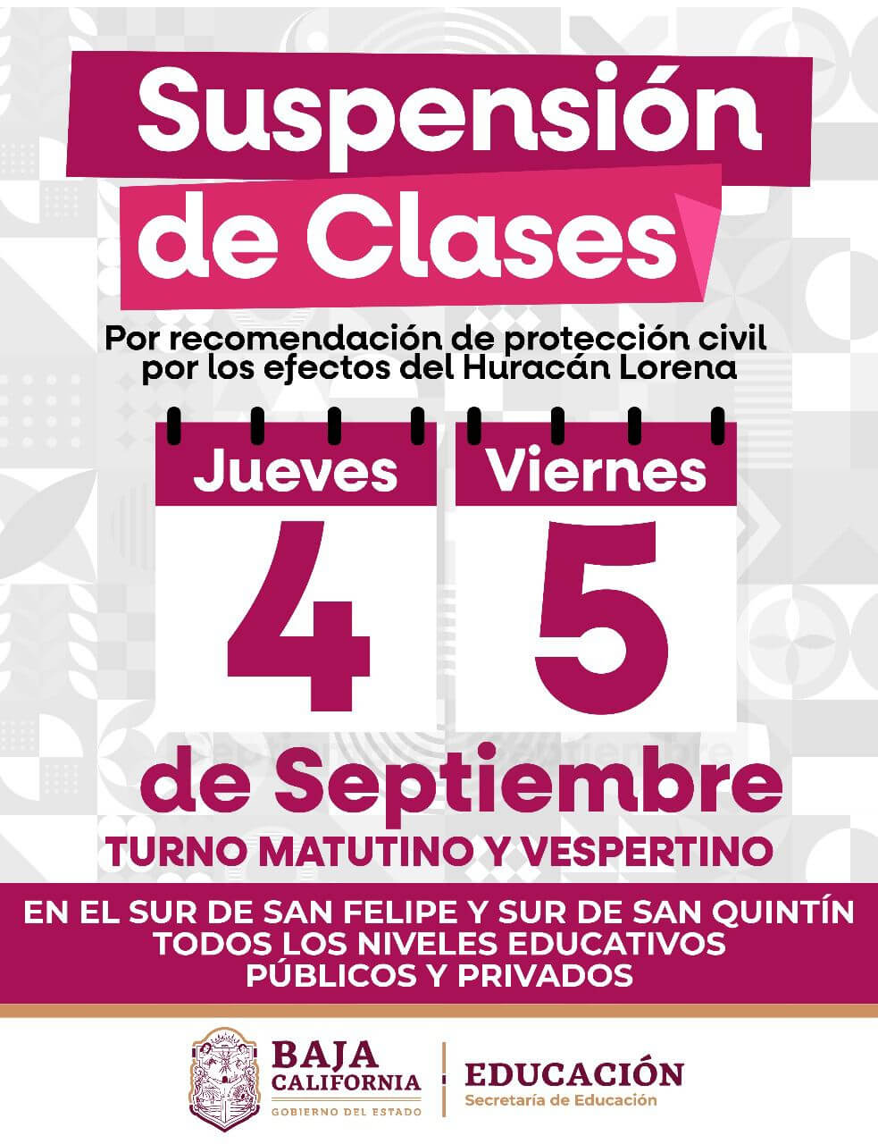 Con el objetivo de proteger la integridad de la población, la Secretaría de Educación, replicará las recomendaciones de la Coordinación Estatal de Protección Civil emite las siguientes recomendaciones, de suspender clases en todos los niveles educativos en el sur de San Quintín y en San Felipe durante los días jueves y viernes.